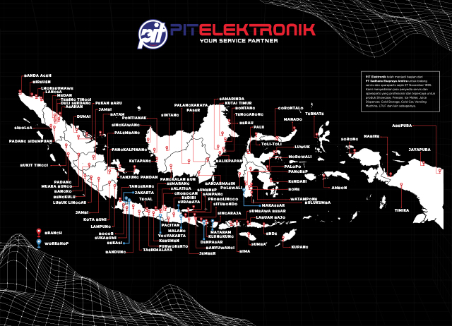 PIT elektronik memiliki cabang di Bekasi, Bandung, Yogya, Surabaya, Denpasar dan kota2 lain di Indonesia. Kualitas pekerjaan dan kualitas spare part yang kami gunakan telah diakui secara luas dan kami terus berusaha memberikan yang terbaik. PIT elektronik secara berkala memberikan pelatihan bagi teknisi-teknisinya agar memilki kualitas yang sama dan mendapatkan informasi akan teknologi pendingin terbaru.